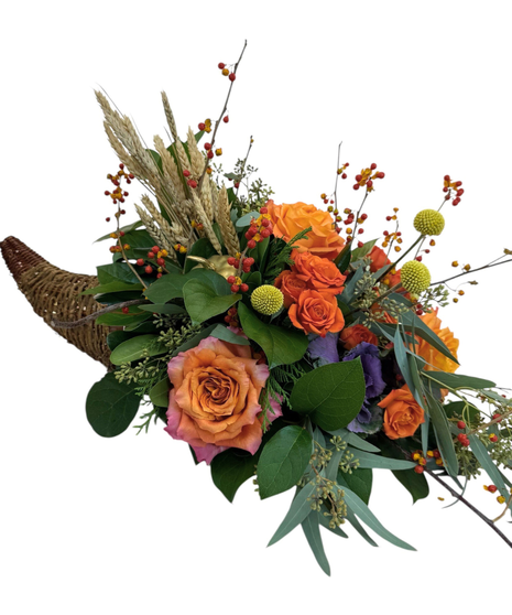 Overflowing with autumnal charm, Abundance is a showstopping horn of plenty that sings of gratitude and celebration. Featuring sunset-hued roses, golden crispedia, and deep greenery with bursts of bittersweet berries, this modern take on the cornucopia is rich in texture and color. Wisps of wheat and textural accents nod to the harvest season.