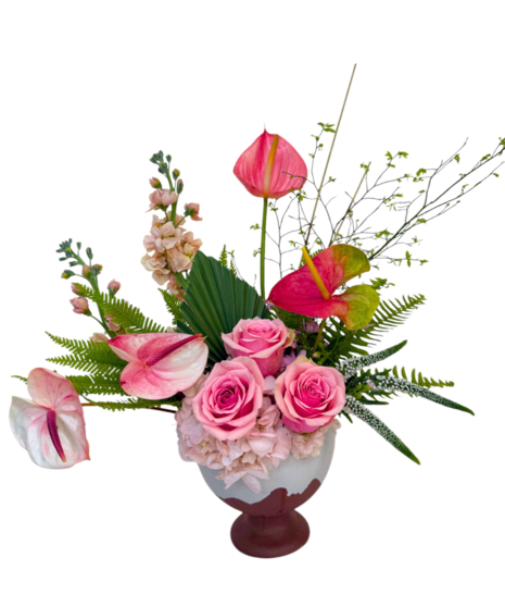 Introducing Anthuriums & Attitude, a spirited floral arrangement that exudes both elegance and a dash of bold personality. This stunning bouquet features passionate roses, exotic anthuriums, lush hydrangea, and charming stock, all artfully arranged alongside vibrant spring greens. Perfect for brightening any space, it effortlessly combines classic beauty with a contemporary twist.