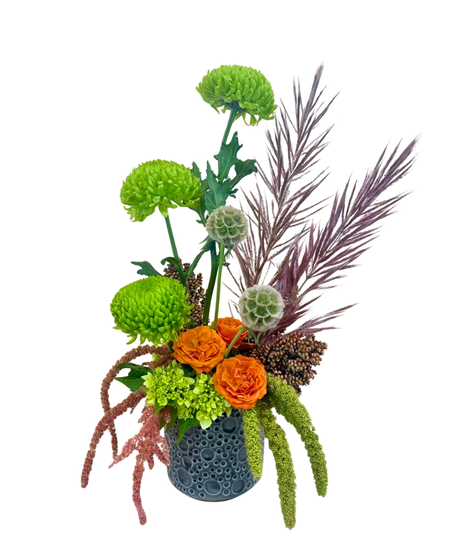 Playful, festive, and full of fall charm—Bubble, Bubble Toil and Trouble is Halloween cheer in floral form. Bright pops of orange and green pop among textural autumn accents, creating a spirited arrangement that’s more boo-tiful than scary.