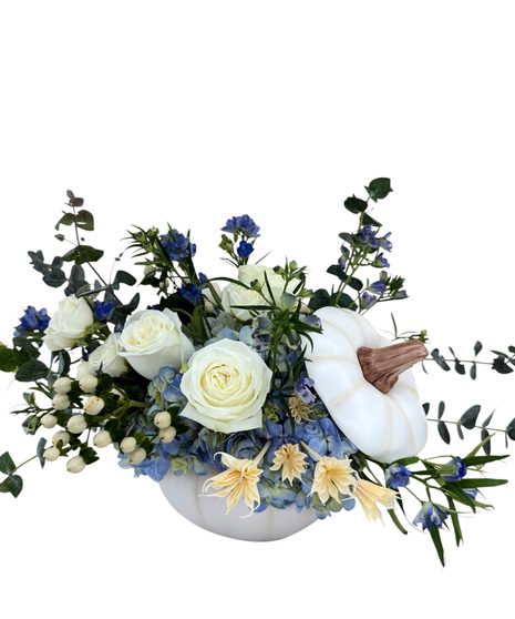 Cool, serene, and softly sculpted, Cinderella’s Pumpkin captures the quiet beauty of winter in bloom. Nestled in a matte white ceramic pumpkin, this arrangement features ivory roses, powder-blue hydrangeas, and delicate spray delphinium, accented by silver eucalyptus and snowberries.