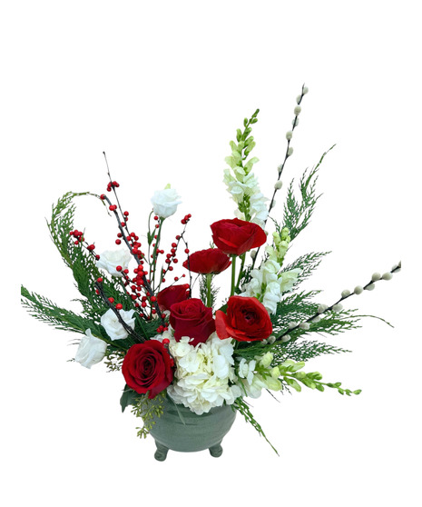 Classic holiday elegance gets a lyrical twist in our Crimson Carol arrangement. A striking blend of velvety red roses, snowy white blooms, and graceful winter greens sets the stage for a design that feels both timeless and dramatic. Sprigs of red berries, soft pussy willow, and delicate snapdragons add height and texture, creating a look that’s as joyful as your favorite seasonal refrain.