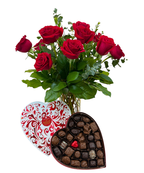 Classic romance, with a decadent twist. Crimson & Cocoa pairs twelve velvety red roses with a heart-shaped box of gourmet chocolates for a gift that speaks straight to the heart (and sweet tooth). Lush greenery adds depth and drama to the timeless blooms, while the rich assortment of handcrafted chocolates offers something for every craving—from silky caramels to nutty pralines.
