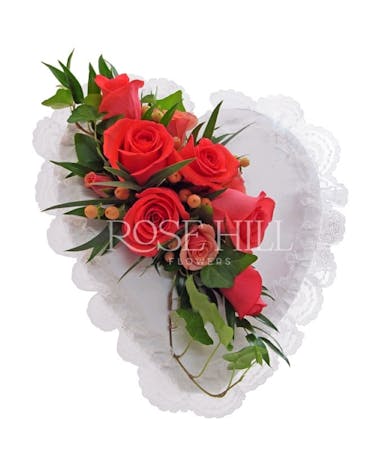 Roses beautifully accent this heart-shaped pillow inside the casket.