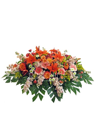 The spray is adorned with a rich tapestry of colors featuring vibrant orange lilies and roses, which symbolize the energy and passion of a life well-lived. Soft pink gerberas and peach roses complement these, adding a gentle touch of tenderness and sympathy. The floral display is interspersed with delicate white blossoms, which provide a contrast that highlights the deeper hues, lending an air of solemnity and grace. Surrounding these blooms are various green leaves and foliage, which frame the flowers beautifully and add to the overall lushness of the arrangement. Each element of the "Grace" casket spray is chosen for its beauty and ability to convey a message of reverence and remembrance.