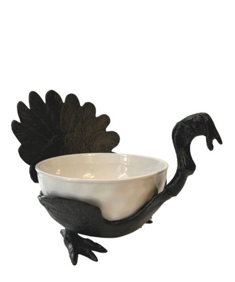 Let us create this whimsical Farmhouse Turkey arrangement for your Thanksgiving table. The cast iron turkey holds a white ceramic serving bowl that is overflowing with hues of the harvest. Sunflowers, roses and hydrangea showcase their rich colors in this unique arrangement.