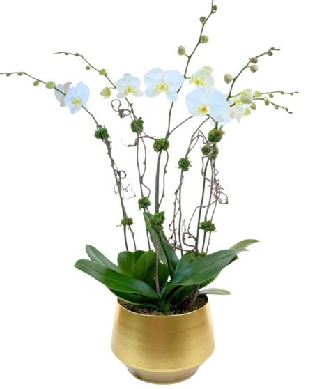 Graceful, timeless, and effortlessly elegant—this double-stemmed orchid duo is the epitome of luxury in bloom. Each stem bursts with pristine white Phalaenopsis blossoms, artfully arranged in a sleek, modern gold container that adds just the right touch of glam. With two double-stemmed orchids, this premium piece brings height, poise, and presence to any space—perfect for celebrating milestones, elevating home décor, or simply making a statement of refined beauty. A living gift that whispers sophistication.