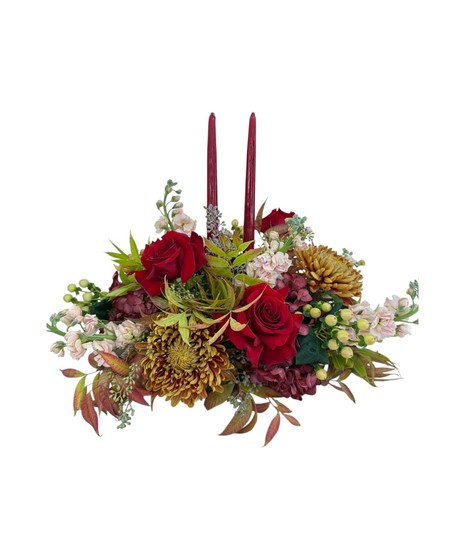 Warm, rich, and effortlessly elegant, Harvest Glow is the Thanksgiving centerpiece that makes your table feel as special as the people gathered around it. Deep red roses, golden mums, and soft blush stock are artfully arranged with autumn foliage and seasonal berries, all crowned by two taper candles in a rich burgundy hue. The result is a centerpiece that glows with the cozy magic of fall—like candlelight flickering on a crisp November evening.