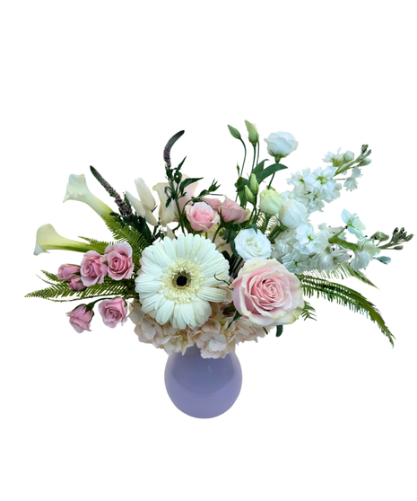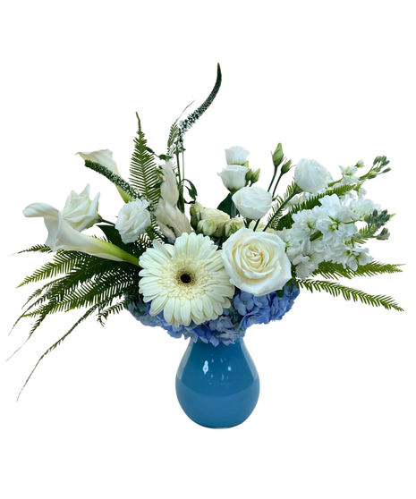 Cue the cuteness! Hey, Baby! is all snuggles and smiles, with pink or blue blooms tucked into a fluffy bed of crisp white calla lilies, stock, gerbera daisies, and hydrangea. Styled in a coordinating vase, this cheerful arrangement is full of life and ready to celebrate the tiniest new arrival!