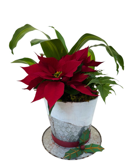 Add a touch of whimsy to your winter decor with our Holly Jolly arrangement. Nestled in a charming metal container shaped like a vintage top hat—complete with holly leaf detailing and a festive red band—this classic red poinsettia is joined by complementary green foliage for extra texture and cheer.