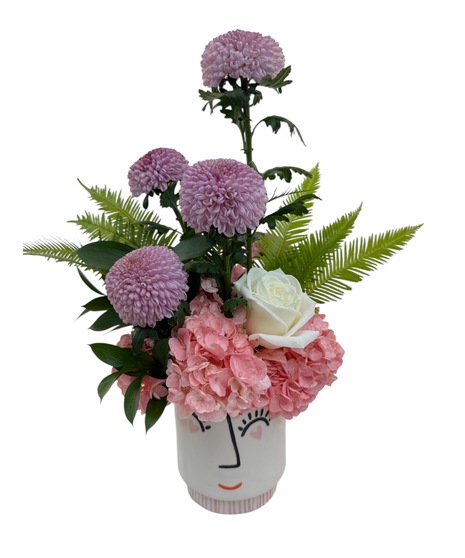 Celebrate love with Love Is in the Hair, a whimsical yet sophisticated floral arrangement that makes any moment unforgettable. Artfully arranged in a playful ceramic vase with a sweet, smiling face motif, this bouquet features lush pink hydrangeas, soft lavender pom?pom chrysanthemums, and a pristine white rose, accented with verdant greenery. Every stem is selected for its color harmony and textural balance, creating a piece that feels both modern and romantic.