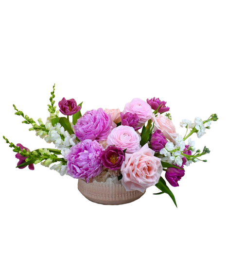 Fresh, graceful, and full of life, Mother’s Delight is designed to honor her with effortless beauty. A lush base of hydrangea creates a soft, cloud-like foundation, while peonies and ranunculus take the spotlight, adding rich texture and layered color in shades of pink and magenta. Tulips and fresh greenery bring a natural sense of movement, giving the arrangement a gathered-from-the-garden feel.