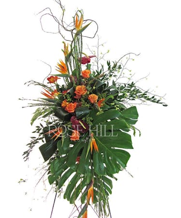 Birds of Paradise, known for their striking appearance that resembles a bird in flight, are the centerpiece of this arrangement. Their vibrant orange and blue hues symbolize joy and paradise, bringing a sense of uplifting serenity to any setting. Complementing these are vibrant roses in rich oranges and other complementary colors that add depth and warmth to the display, symbolizing love and heartfelt respect. Including monstera leaves adds a layer of tropical flair and dense greenery, enhancing the overall lushness of the arrangement. These large, glossy leaves not only provide a dramatic contrast to the vivid colors of the flowers but also symbolize honor and longevity. "Paradise" is more than just a floral arrangement; it is a tribute that honors a loved one with beauty and grace. It's an expression of admiration and remembrance designed to convey deep feelings of respect and comfort to friends and family during their loss. This arrangement is an excellent choice for anyone looking to send a memorable and meaningful gesture that reflects the beauty of a life well-lived.