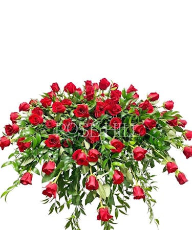 The "Red Rose Tribute" from Rose Hill Flowers in Nashville, TN, is a stunning and deeply emotional gesture of love and respect designed to honor a loved one's memory. This impressive casket spray of a hundred exquisite red roses symbolizes love, courage, and heartfelt respect. The vibrant red roses are meticulously arranged to create a lush and flowing cascade, enveloping the casket in a blanket of beauty and warmth. Red roses have long been associated with deep love and reverence, making them a fitting choice for a final tribute. This arrangement captures the essence of passion and the deep bond shared with the departed, serving as a powerful visual expression of eternal love. The lush greenery interspersed among the roses adds to the display's richness and depth, highlighting the roses' vibrancy and bringing a touch of natural beauty to the solemn occasion.