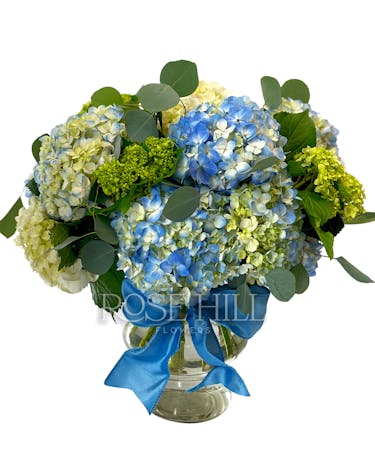 "Rhapsody" by Rose Hill Flowers is a stunning ensemble of hydrangeas, an enduring emblem of grace and beauty. This tasteful arrangement merges the soothing hues of blues, greens, and whites in a captivating display. The blossoms are delicately nestled within the embrace of an 11" Bambino vase, exuding a charm that is both timeless and modern. This bouquet is more than a visual treat; it carries the subtle message of appreciation and remembrance, making it a perfect token for a fourth wedding anniversary. Hydrangeas, with their lush, full heads of petals, symbolize gratitude, grace, and beauty—reflecting the growth and harmony of a four-year-long partnership.