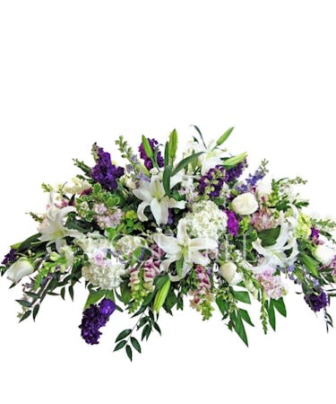 This lovely casket spray features beautiful flowers in shades of purple, pink, and white—a wonderful tribute to your loved one. It pairs perfectly with the Royal Design Sympathy Basket and the Royal Design Standing Spray.