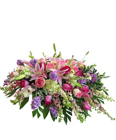 This lovely casket spray features roses in various shades of pink with accents in white, purple and green.