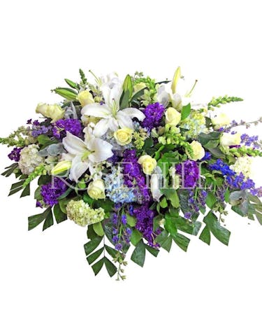 This beautiful casket spray features flowers in shades of purple, whites and green. It features hydrangeas, lilies and roses for a beautiful serene touch.