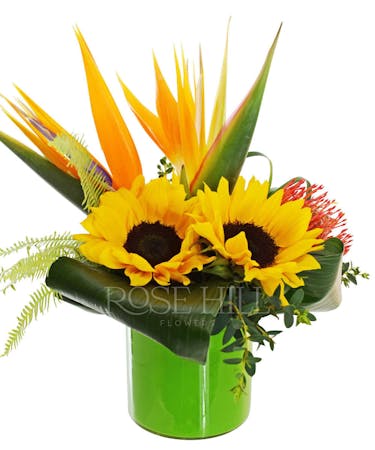The arrangement is thoughtfully designed with an assortment of tropical foliage that frames each bloom, providing a lush backdrop that enhances the vivid colors. All these elements come together in harmonious contrast, making Sunbeams a statement piece that can brighten any space and occasion. Whether it's to celebrate, to show appreciation, or to add a splash of joy, this Rose Hill Flowers masterpiece delivers a message of warmth and vitality.