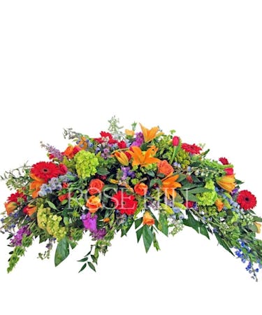 Show your heartfelt respect with this beautiful casket spray in the shades of the sunset featuring roses, hydrangeas, gerbera daisies, and lilies. Truly beautiful.