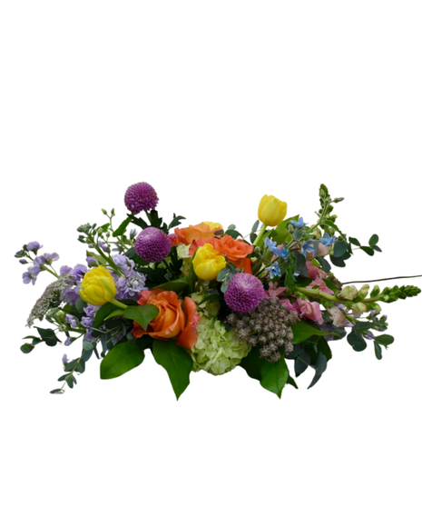 The Vernal Delight is a striking spring centerpiece centered around dynamic shape and colorful spring flowers. This arrangement is carefully crafted with orange roses, yellow tulips, and delicate stock flower, truly capturing the vibrance of new growth that comes with spring. Perfect for celebrating any spring holiday or Mother's Day dinner.