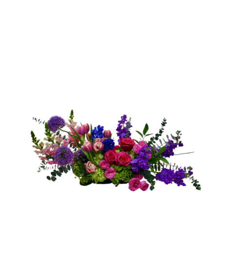 Spring Fling is a lush, garden-style centerpiece that captures the romance of spring in full bloom. Layers of vivid pink roses, playful tulips, and sculptural allium are nestled among soft hydrangea and fragrant stock, creating a rich tapestry of color and texture. Pops of violet and blue add depth, while airy greenery gives the arrangement a naturally gathered, effortless feel.