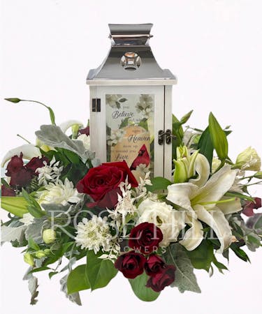 This "Cardinal" 13.5 inch memorial lantern encircled with fragrant white lilies and red roses is the perfect way to memorialize your loved one.