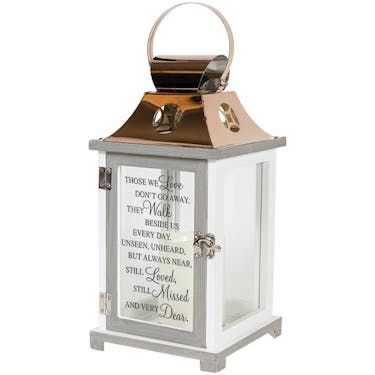 Lantern reads: "Those we love don't go away, they walk beside us every day. Unseen, unheard, but always near, still loved, still missed, and very dear."