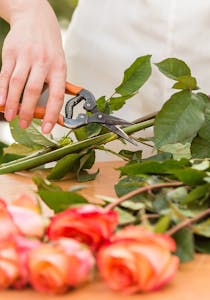 Roses typically have layered, overlapping petals that form a bowl-like or spiraling bloom structure. They come in various colors, including red, pink, white, yellow, orange, purple, and even multi-colored varieties. (While some roses will naturally bloom in these hues, other rose colors, such as "black," blue, and rainbow, are genetically manipulated or dyed.) Depending on the variety, roses can range from small, miniature blooms (like spray roses) to large, dramatic flowers (like garden roses). Most rose species have thorns or prickles on their hardy, dark green stems, which serve as a natural defense mechanism. These sharp structures can vary in size and number.