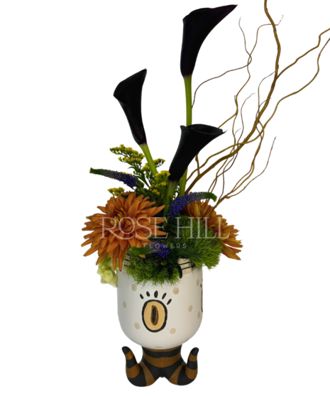 This ghoulish ceramic container is bursting with seasonal blooms. The eggplant calla lilies and orange mums create a spooky arrangement in this scary keepsake container.